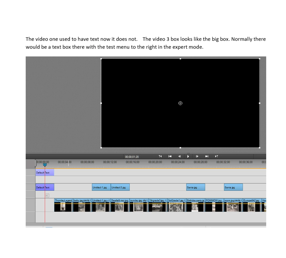 I have saved my project many times. all of a sudden when I open the same project my text titles show no text! If I try to add another text title there is no text box that pops up. What happen. Some type of corruption. Eveything else seems to work fine