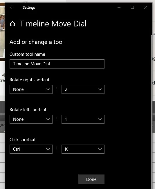 Has anyone had any success setting up the Microsoft's Surface Dial in Premiere Elements 2019? I believe I have configured correctly to step forward, back and snip as per below images.
