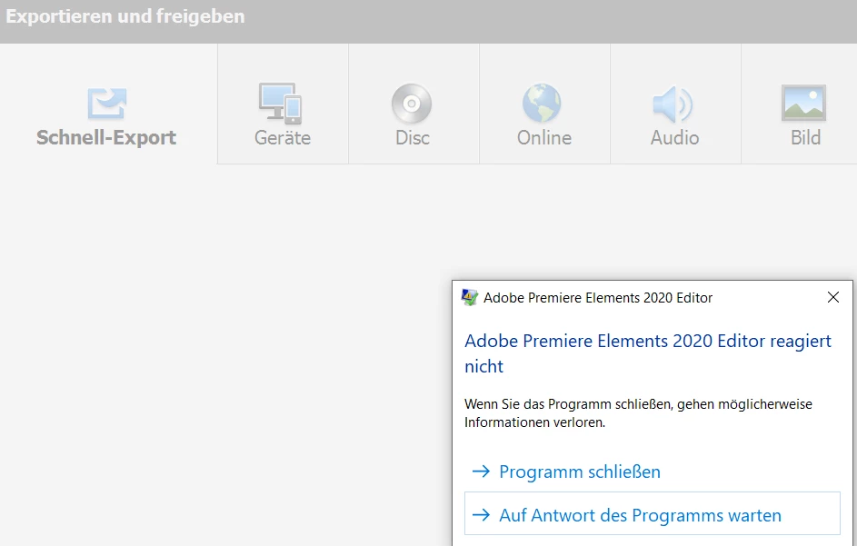Premiere Elements 2020 video editor: enter export and share and it freezes