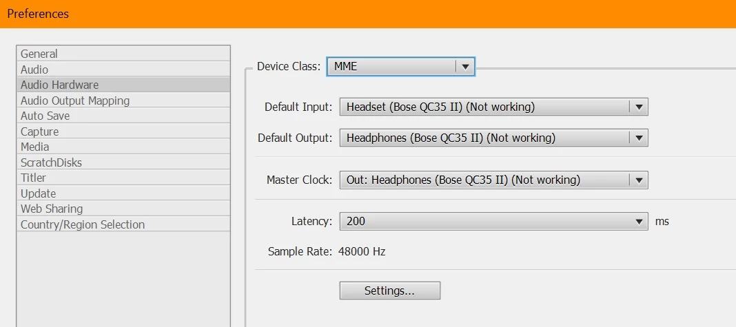 My headphones no longer work within Premiere Elements. They function normally outside of the application. In audio settings> audio hardware I have two choices, ASIO and MME. When set to ASIO the audio works fine within the application on speakers. When set to MME the headphones are listed.