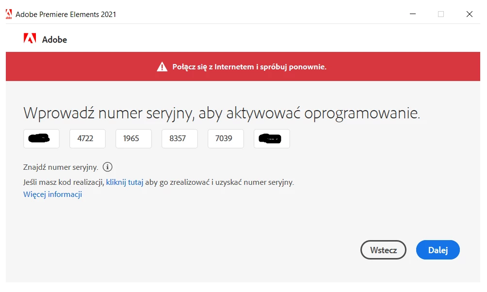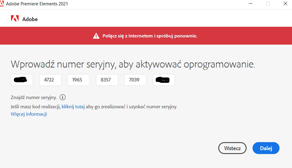 Hello, I have a problem. After I installed Adobie Premiere Elements I have to register serial no which I received from the e-shop. After I fill the number and try to activate I can see the problem "please connect with the Internet and try again".