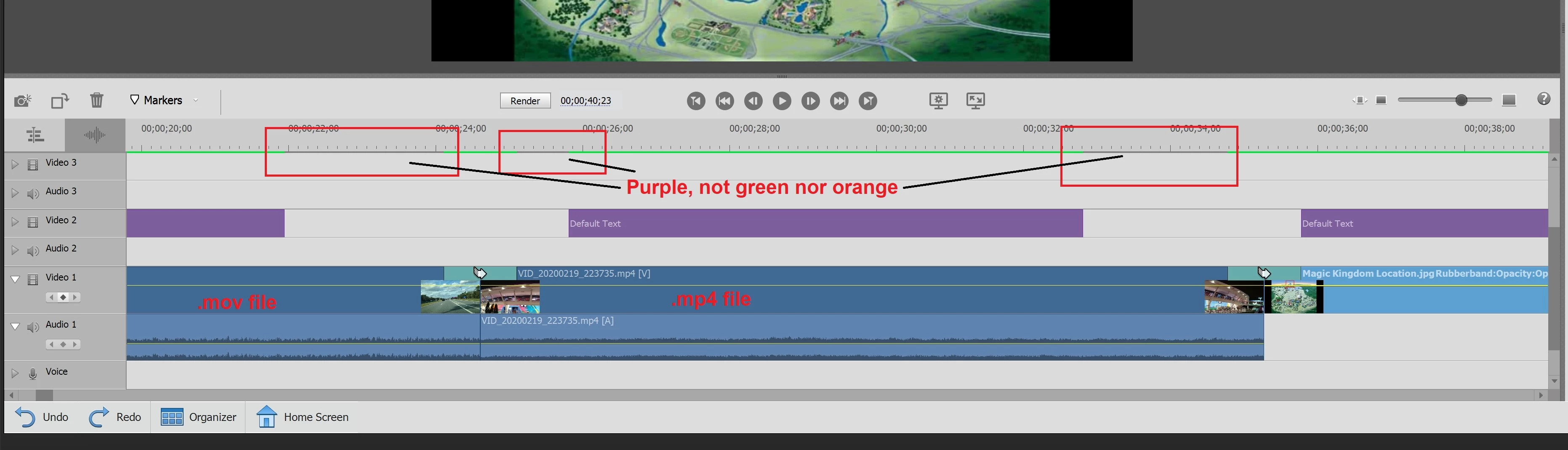 In this example, you can see purple over the transition between the .mov file and the .mp4 file (more often, it is orange). This happens onl almost every project I've developed. If I don't correct it (replacing the orange or purple with green), when I run the rendered project, it "jumps" a moment before displaying the text in video 2 line.