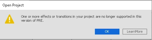 Receive error stating "one or more effects or transitions in your project are no longer supported".