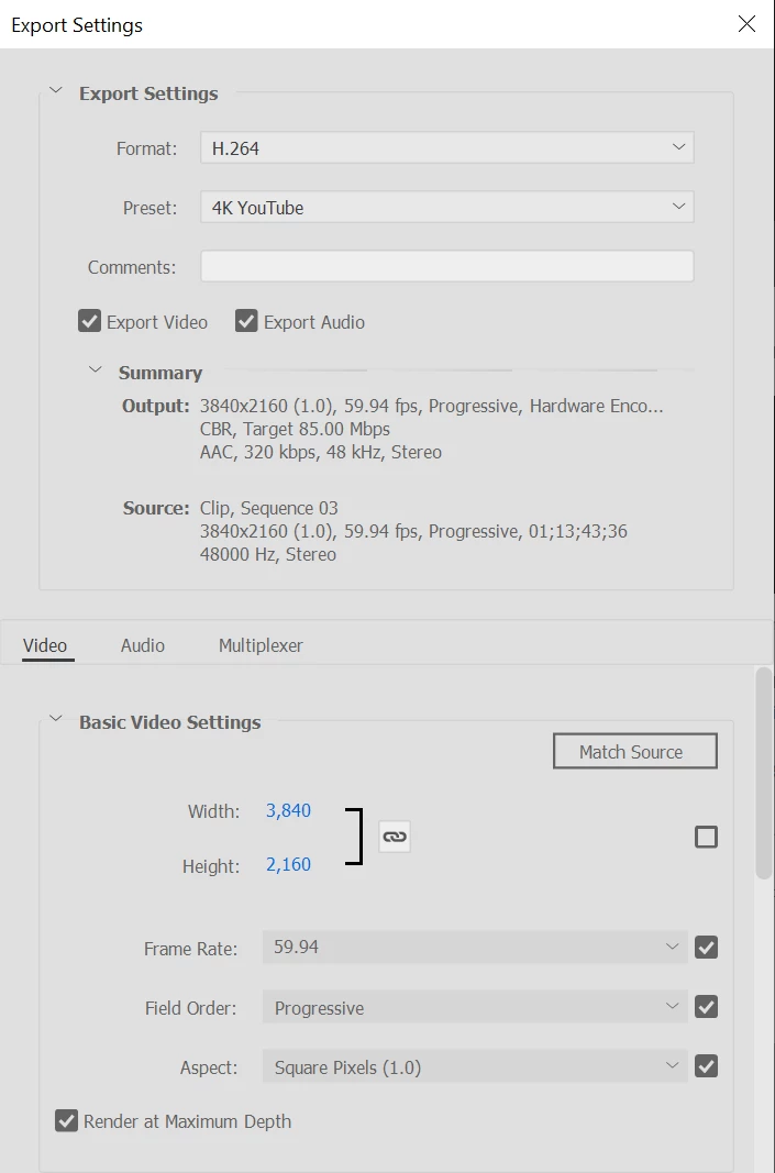 I've tried the premade "4K Ultra HD" render under the "Computer" tab, and I've tried setting the Key Frame Distance to 1, both of which did not work. I changed the Level to 5.1, but this prevents me from doing a 3840x2160 aspect ratio. I've also tried changing the bitrate to 240Mbps, which helped but not completely. It changed the bitrate to approximately 42Mbps, which is still not enough.