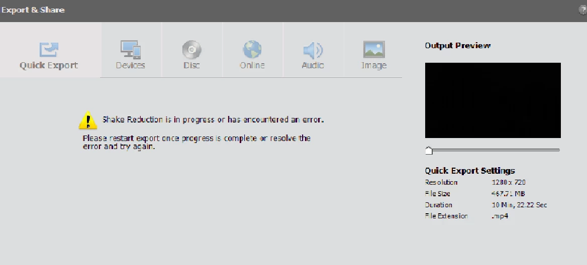 I'm working on a small project where I used the shake reduction feature on a few clips. I was able to export the project once but now every time since, it gives this error: