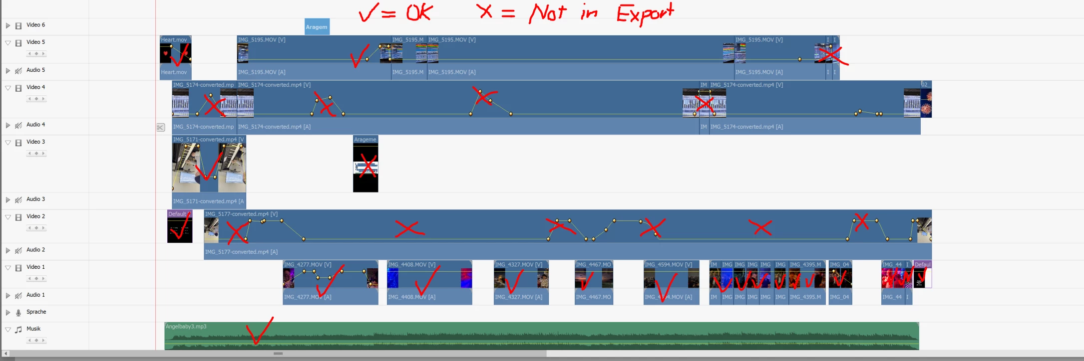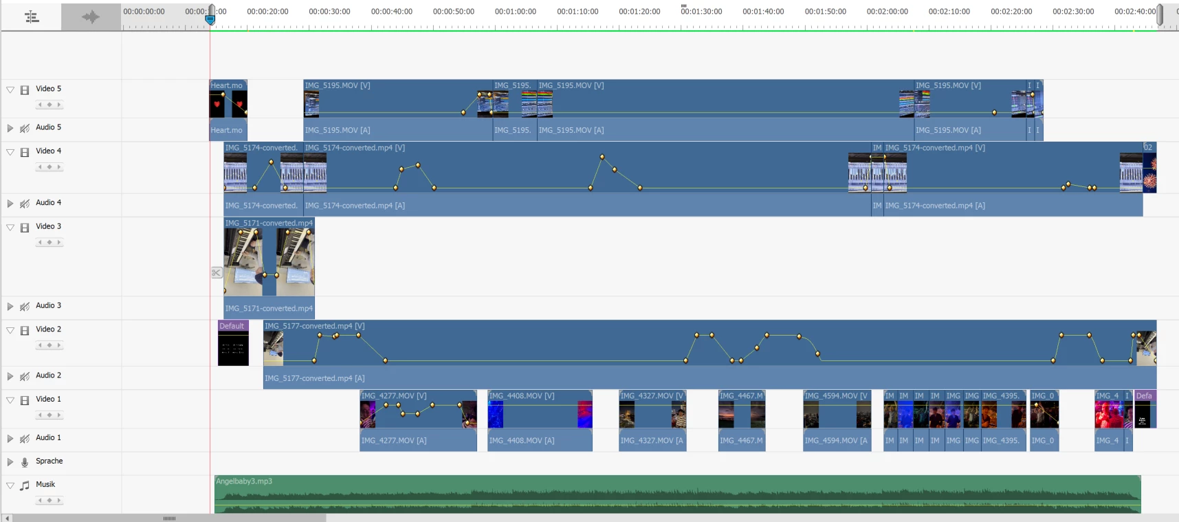 I work with 5 video tracks, all about 2:30 minutes long. In the 5 video tracks I have created a shot from different angles. I play piano and in the background is the Mp3 export from my music software. Now I fade in and out between the different videos with the opacity. (see build)