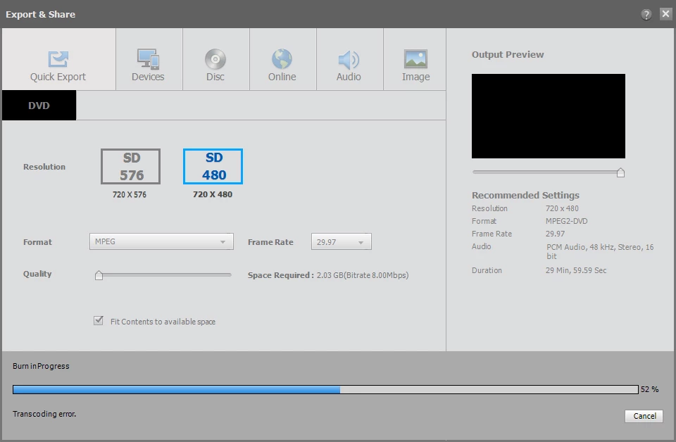 Attempting to create ISO file of a large project (over 3 hours): SD 480, ISO Image 8.5 GB, Fit Contents to available space checked.
