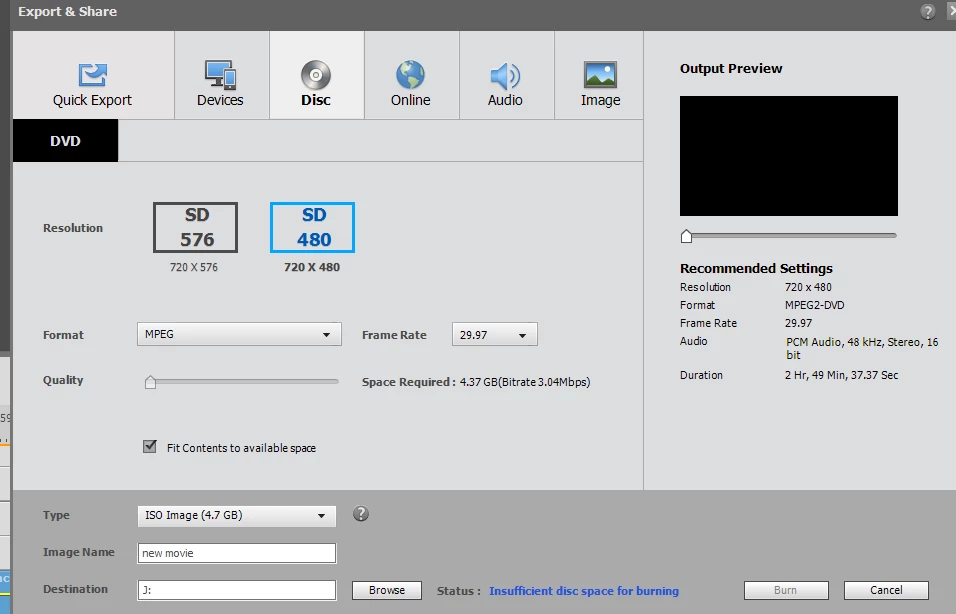 I have tried many different ways but I am unable to create a DVD ISO file and save it to my hard drive. I have over 3 terrabytes available but the message states (insufficient space available). The settings show only 3.7 GB space needed.