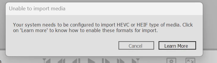 "Your system needs to be configured to import HEVC or HEIF type of media. Click on 'Learn more' to know how to enable these formats for import."