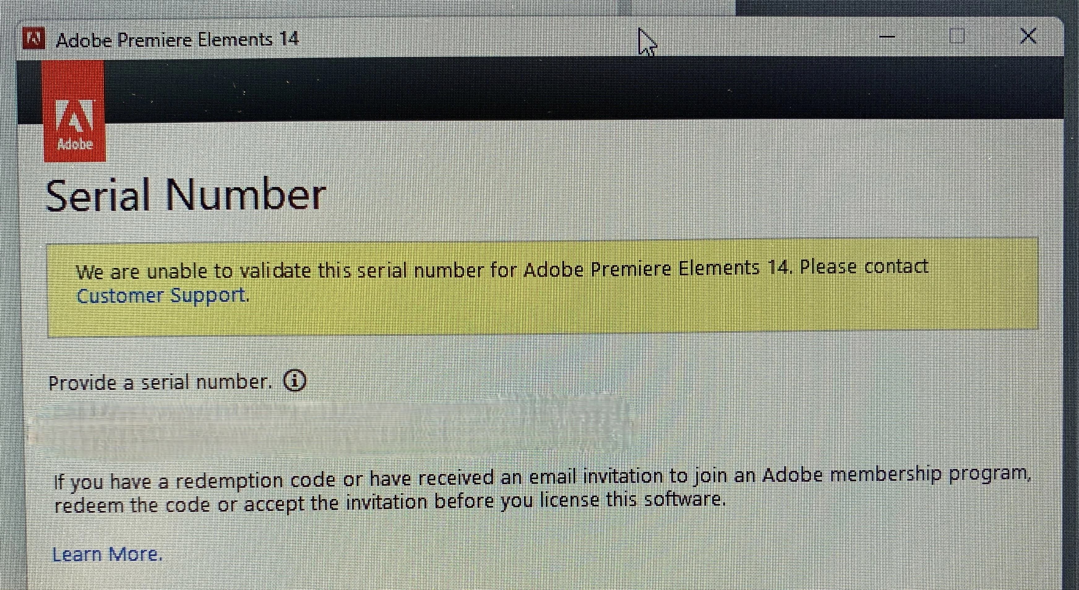 "Unable to validate this serial no. for Adobe Premiere elements 14"