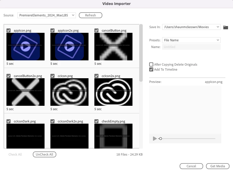 Trying to import mp4 files from an external hard drive plugged to my MAC by USB. When attempting to use the Video importer function it only gives me the option to use 'Source - PremiereElemente_2024_MacLBS'