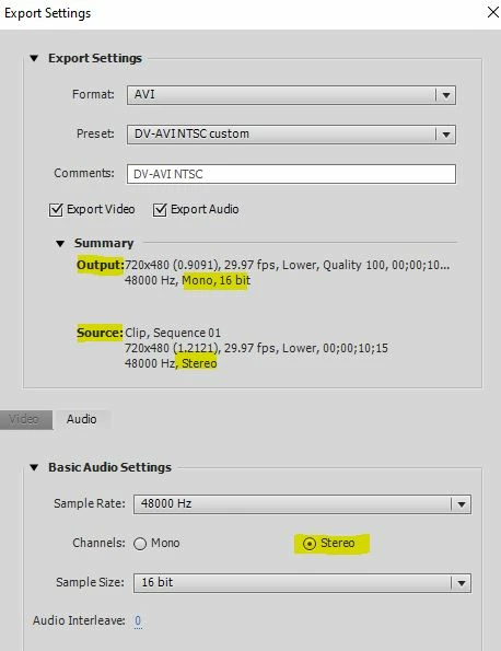 Video project only exports with mono audio instead of stereo when exporting as AVI-DV