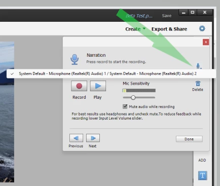 my voiceover doesn't work at all... I tried my own mic over audiointerface, and as well the built in mic.