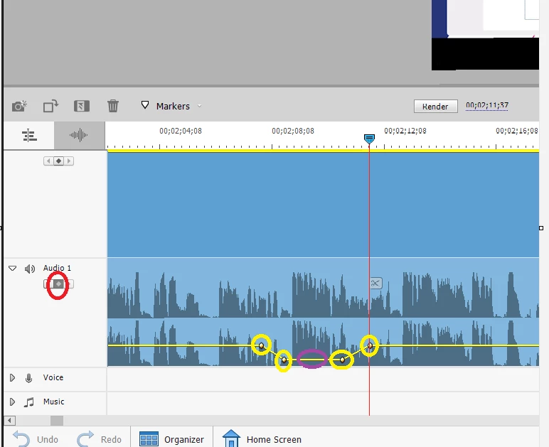 How can I make a justment in audiotrack (music) on a specific place in the musictrack to increase the music after end of a narration and I want to have a higher level of the music, and later on decrease the music when the naration begins again. I know that a yellow horizentally line can move up and down to change the level, but I want to mark on the wantet place to make a dor from where I can increase og decrease the soundlevel. How is the procedure to make that dot on the yellow line?