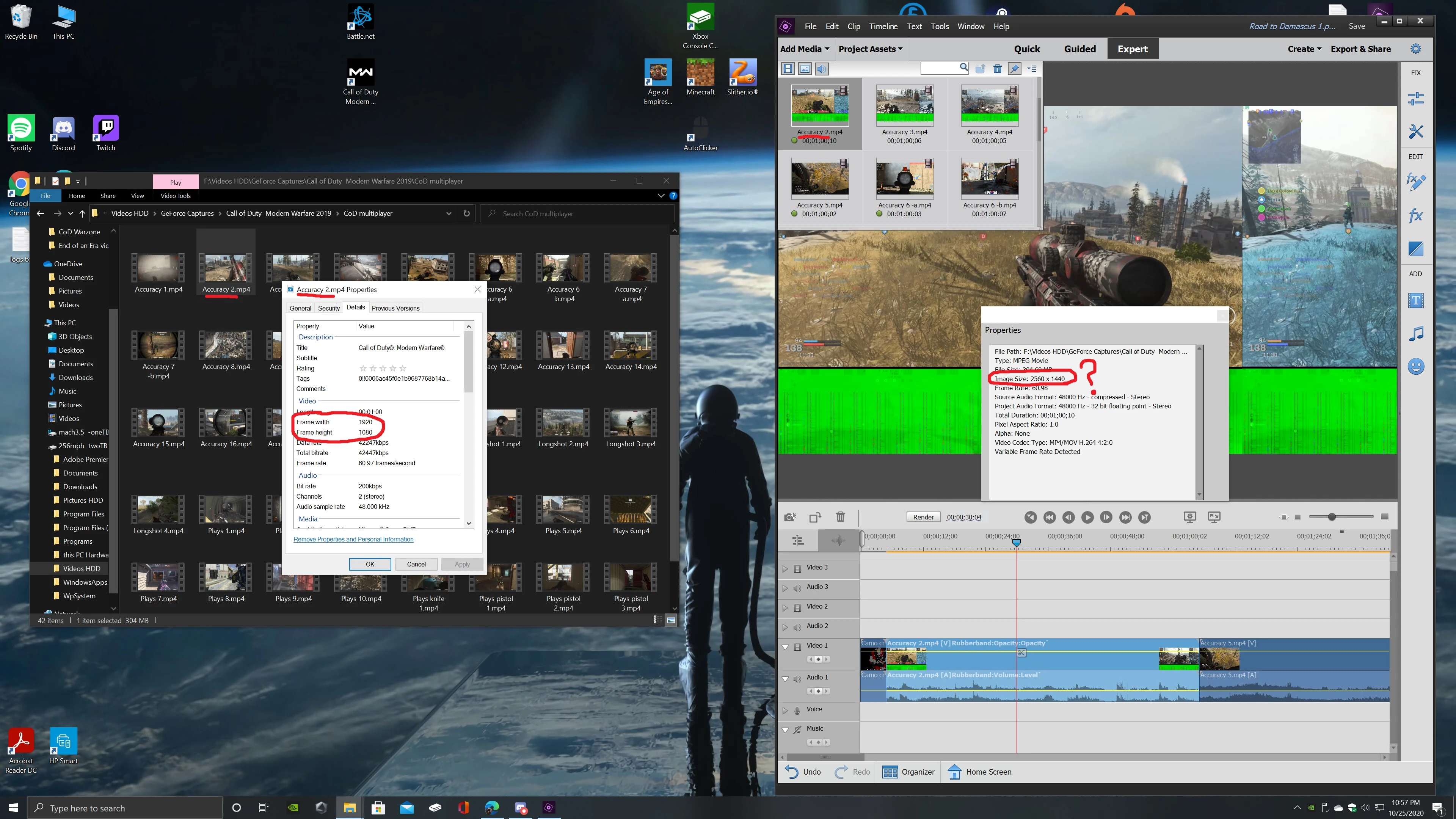 Hi all, I have some 1920x1080 video clips which I captured via Microsoft Game DVR. When I import them then premeire elements says they are 2560x1440 and the image is zoomed out with this green abomination at the bottum, etc. (see attached screenshot). I had the game resolution set to 2560x1440 when I was playing, but my Microsoft Game DVR is set to record at 1920x1080 and it does. When I view the recorded video file in Microsoft's Images program it looks fine. This issue deosn't happen with clips since I started using Nvidia Geforce Shadowplay to record. Is there a way I can fix this 'import resolution bug' in Premeire Elements besides having to zoom in all of my clips?
