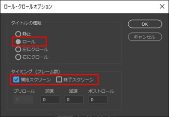 「ロール」にチェックを入れ、「オフスクリーン開始」にチェックを入れて、「オフスクリーン終了」にはチェックを入れません。