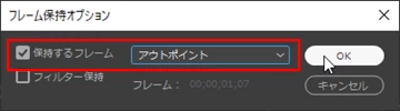 「ポストロール」に停止後の保持時間を「時分秒フレーム」で入力します。2秒なら「200」と連続タイプすればセミコロンまたはコロンが自動的に入力されます。