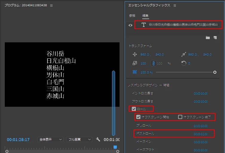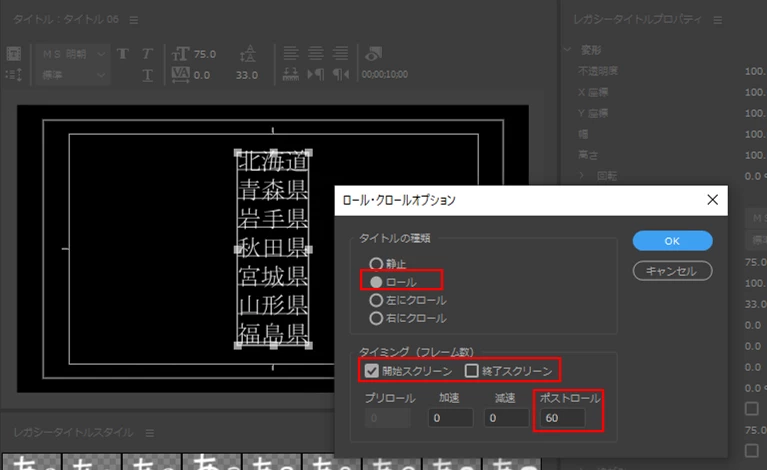 「ロール・クロールオプション」ウィンドウで、「ロール」を選択し、「開始スクリーン」にチェックを入れ、「終了スクリーン」にはチェックを入れません。そして「ポストロール」に、下から上がってきて停止した後の保持時間をフレーム数で入力します。シーケンスが29.97fpsの場合は、「60」と入力すれば約2秒です。これで完成です。