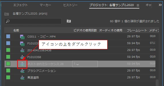 もう一つの方法は、「プロジェクト」パネルにも「ネストされたシーケンス」アセットが作成されています。そのアセットのアイコンの上でダブルクリックしても元に戻ります(下図赤枠部)。