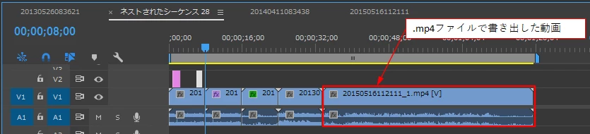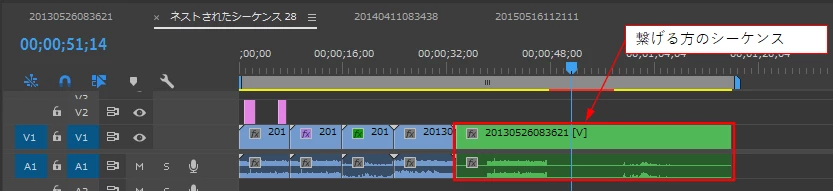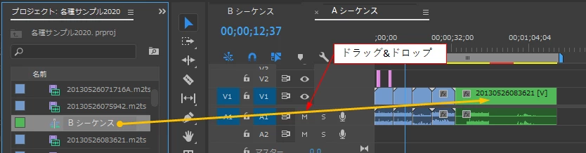 さらに、Aシーケンス内の複数クリップの最後尾にBシーケンス全体を繋げることもできます。もちろんその逆もできます。これは上図で示した内容です。