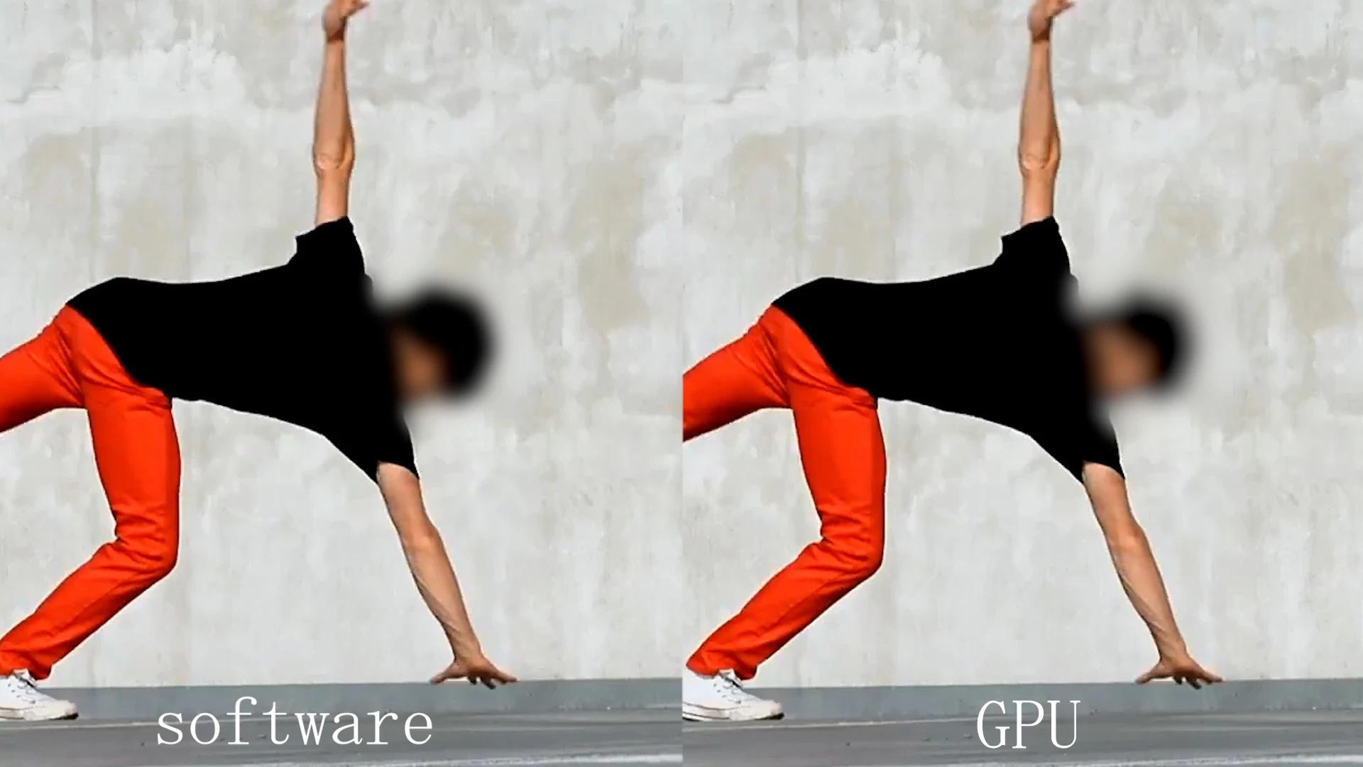 書き出し時間が数十倍も変わってしまうためGPU処理で書き出したいのですが、黒色の部分が変になってしまうので、映像はソフトウエア処理の結果が理想です。
