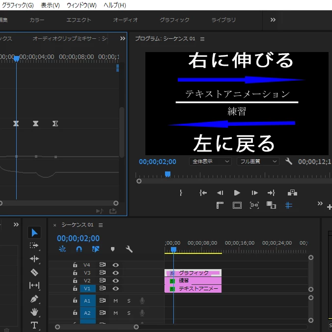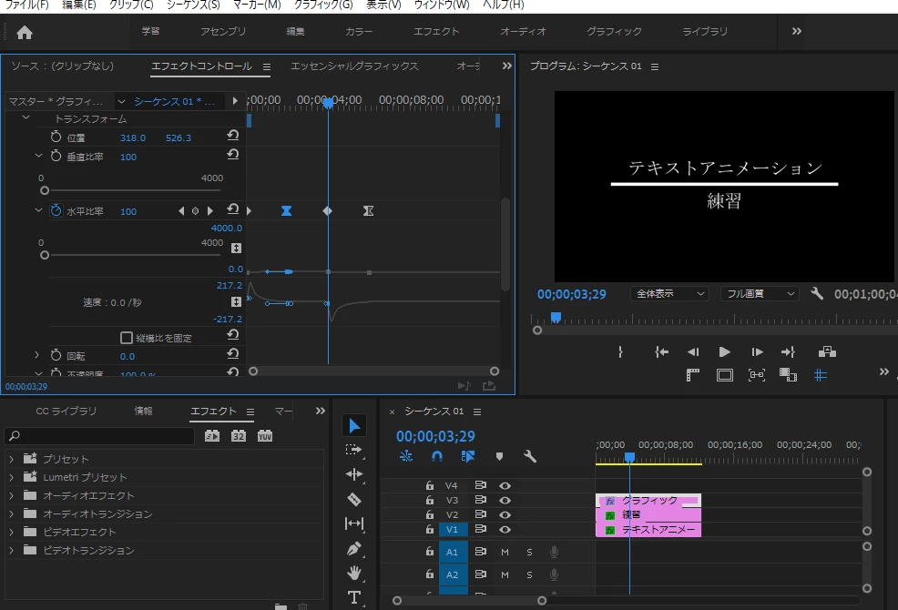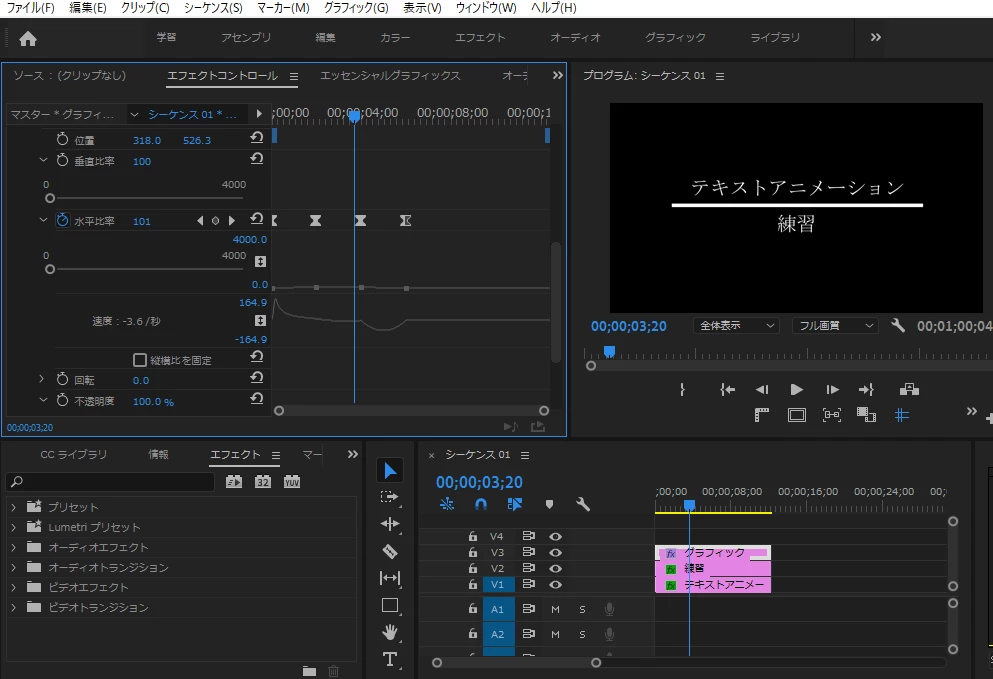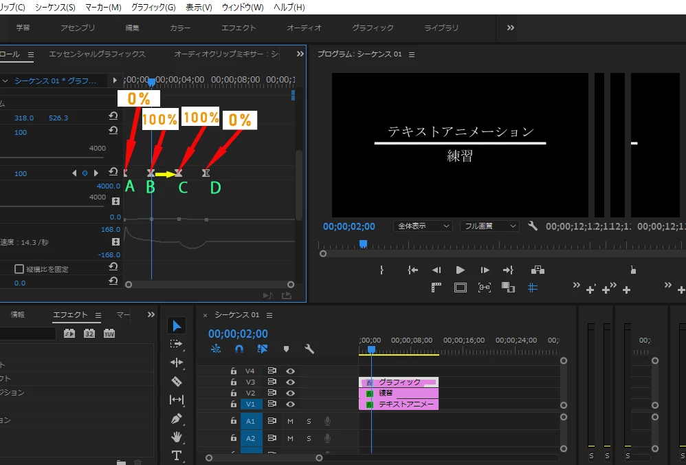 伸びる線は作ることができたのですが、キーフレームB→Cに行くまでになぜか水平比率が「104」になり、そこからまたCに行くと「100」に下がります。100、101、102、103、104、103、102、101、100という感じです。B→Cに行くまでに意図した長さより線が長くなってしまうのです。キーフレームはBとCはどちらも水平比率「100」にしているのにです。