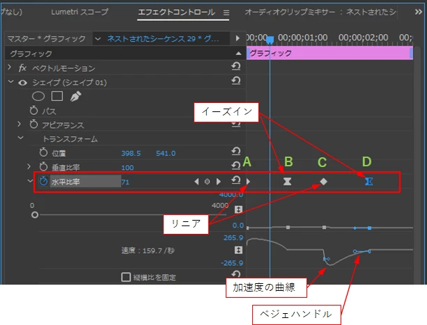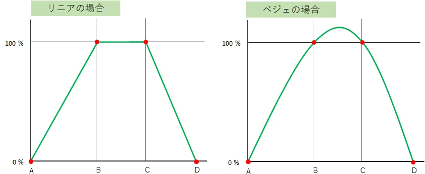 キーフレームの砂時計はAB、CDを別々に2組で選択してベジェにしました。そうして線の動きに緩急をつけたのですが、それが原因だと思います。そこを何も触らなければ、B→C間の垂直比率は100のままだからです。この原因と対処法をご存じの方がいれば、教えていただきたいです。