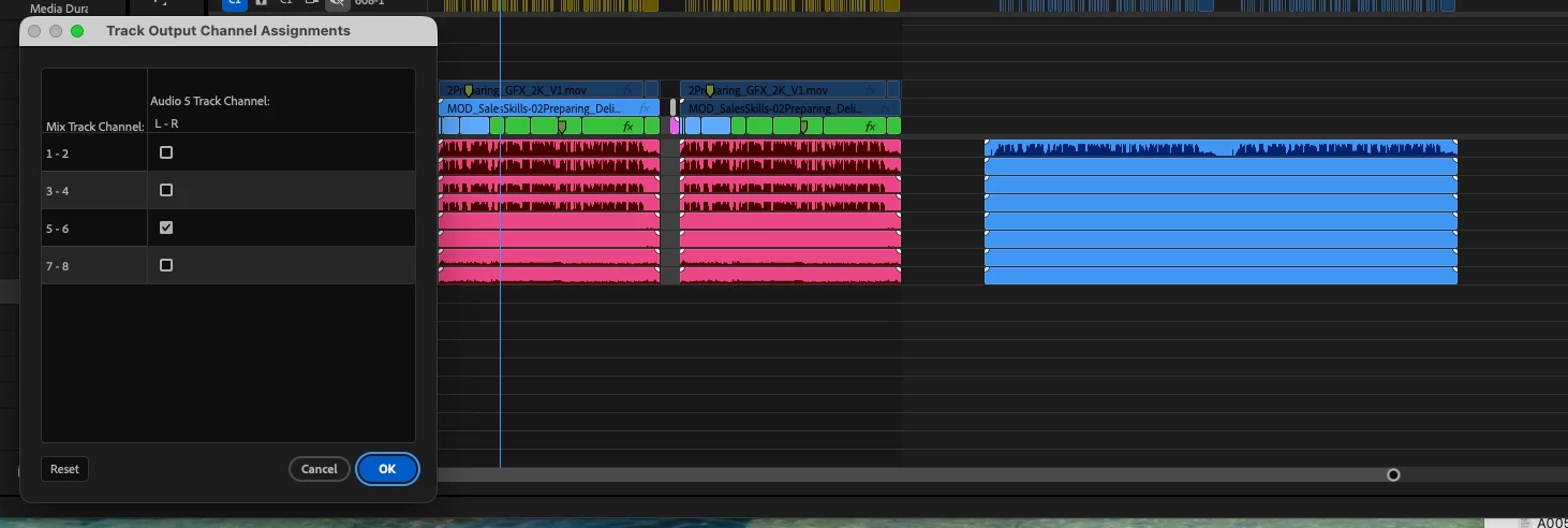 Project set up to import stereo tracks as dual mono so L and R is on channel 1 and 2. Track mixer is set to L on all odd channels and R on all even channels. After I bring in four stereo tracks, making 8 channels total, I set the output channel assignments within the timeline (image 2 shows track 5 as the 5-6 assigned track).