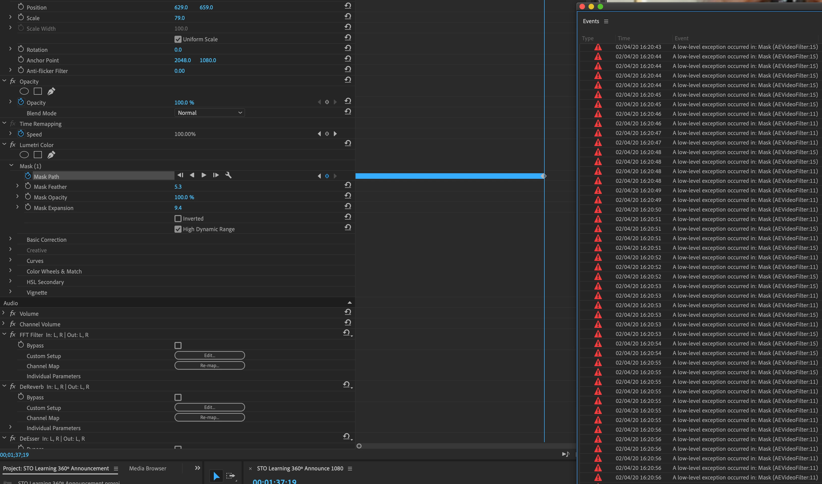 I've been spot color-correcting a video using Lumetri Color with a tracked mask. Already hours in to this work, these errors started showing up as I was 75% through the video. I disabled GPU acceleration on the project and continued, finishing my mask tracking, but the errors continue to pop up throughout the video.