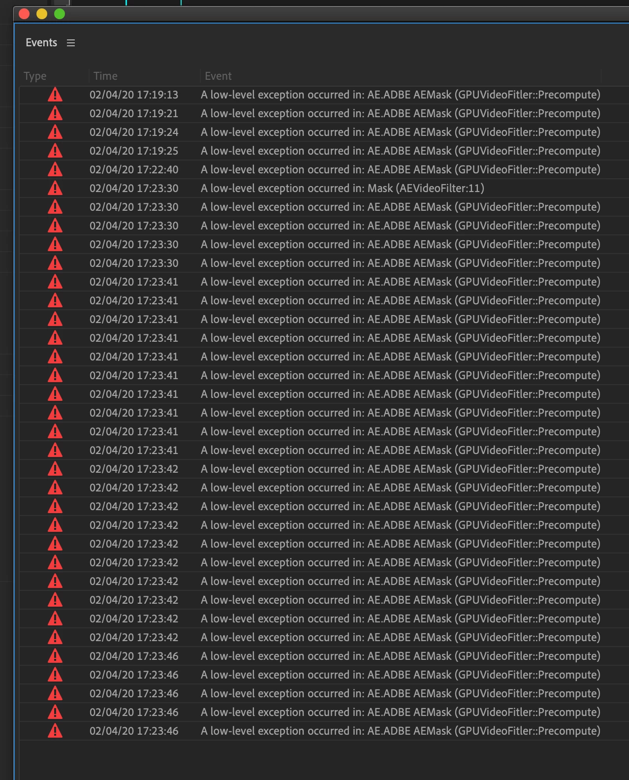 A Low-level exception occured in: AE.ADBE AE MASK (GPUVideoFitler::Precomputer)