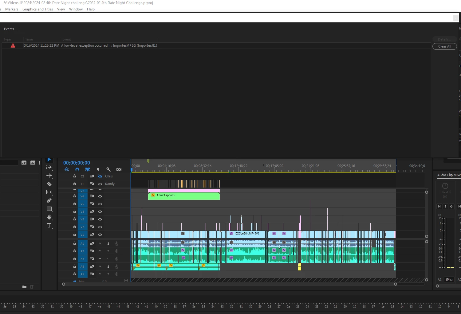 I opened Premiere Pro, and scrub through the timeline when suddenly an error logged with the name of the title and the preview window froze. I could move through the timeline but can't see what i was doing.