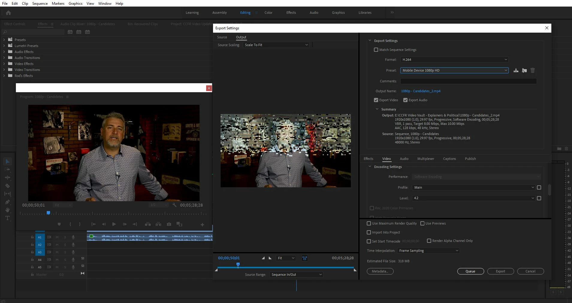 I've been using PP for years, no issues other than some crashing here and there. I went to export a video and this is what I get. The video in the timeline is fine but the export is half distorted, see pic. It seems I can fix it via the encoding options by changing the "level" to unrestricted but the estimated export time takes 9 hours instead of 5 minutes for this simple 5 minute video.