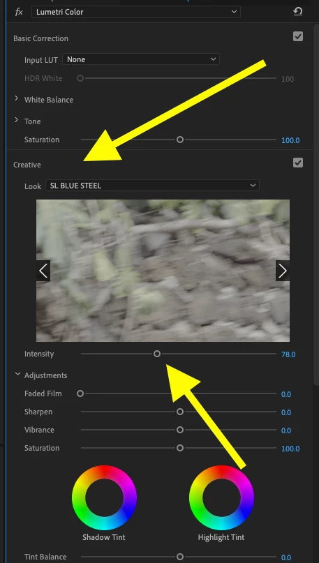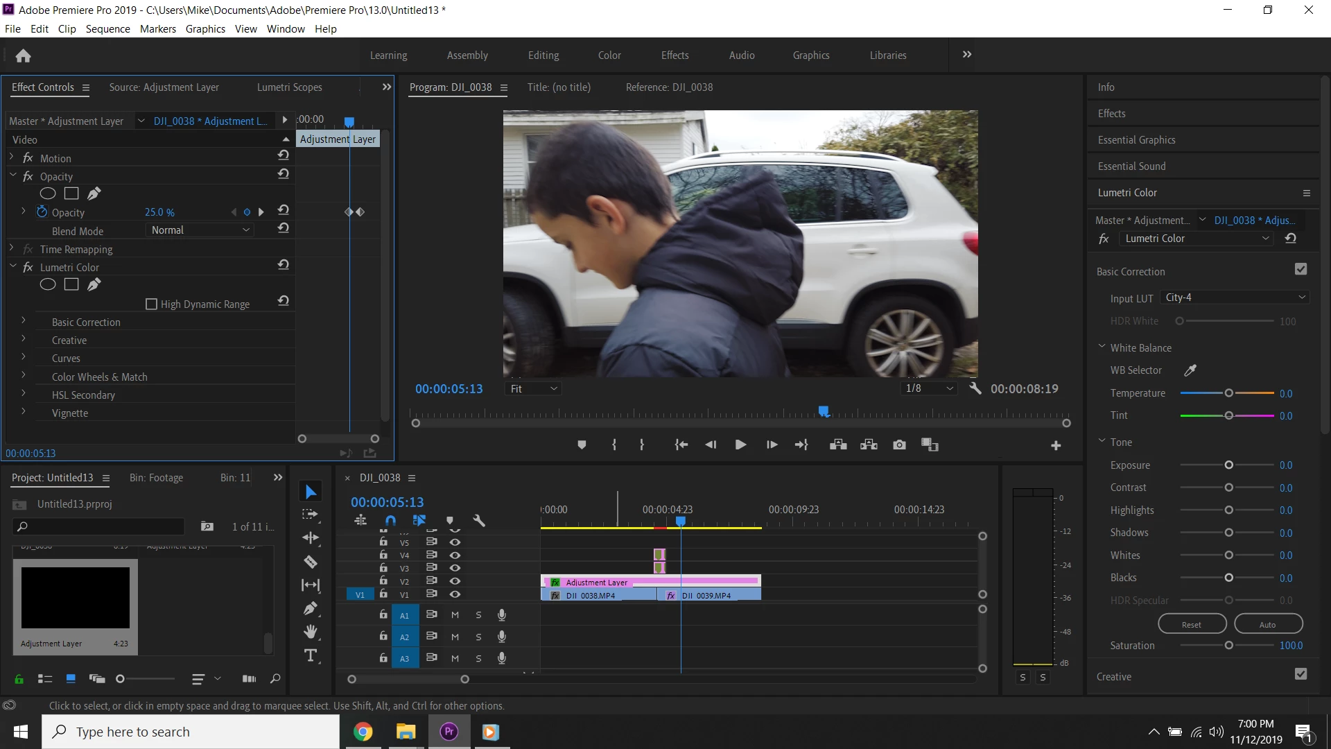 I then add an adjustment layer and add a LUT to it. I decrease the opacity of the LUT in Effects Control down to 40%, for example, because the LUT at 100% is too strong. As soon as I change the opacity on the adjustment layer, and play the video, the transition no longer works.