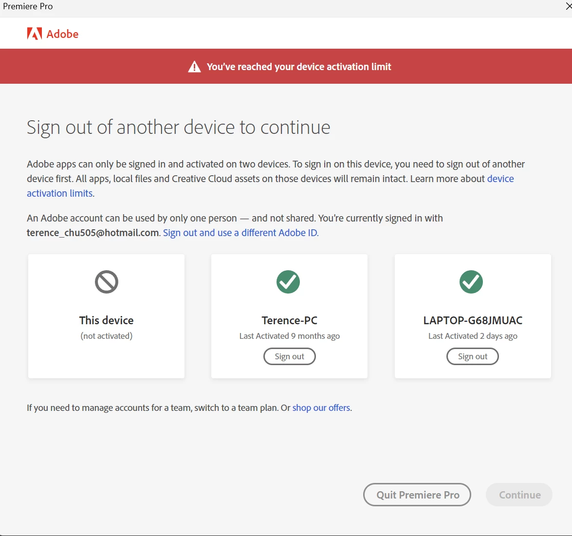 Adobe has detected my device wrongly and result in reaching limit where I have to sign out and sign in again everytime