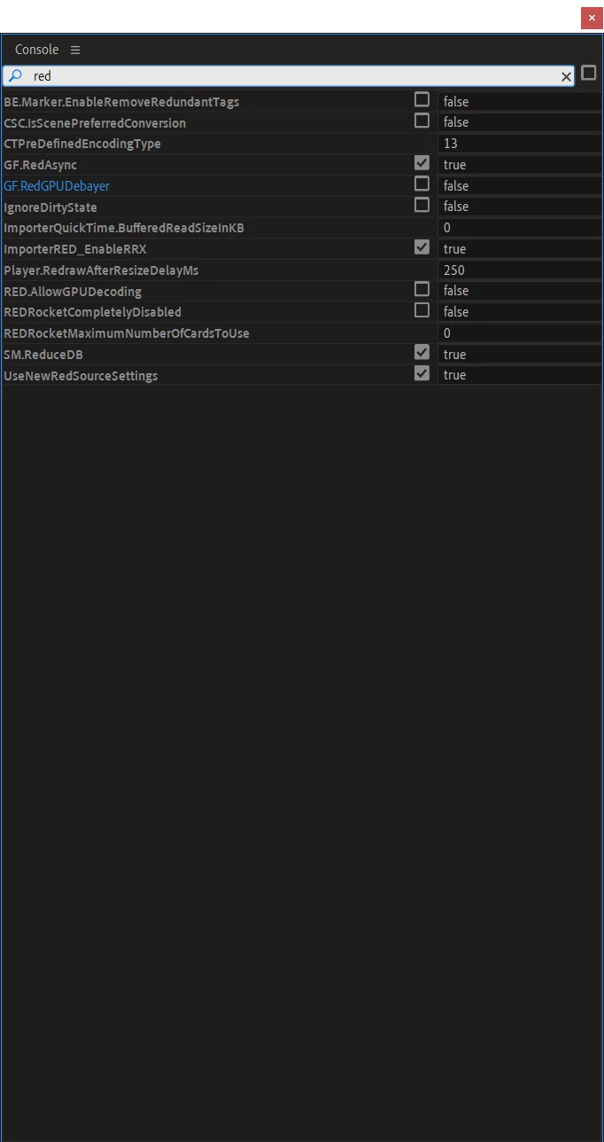 The workaround that has worked for me is launching the console for PP (CRTL + F12), selecting "Debug Database View" and then set "GF.RedGPUDebayer" to false.