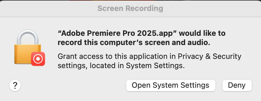 When I launch Premiere, macOS asks me if I want to allow “screen and system audio recording.”