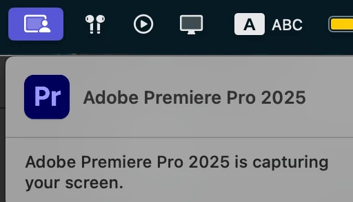 Despite this, macOS still shows a banner saying “Adobe Premiere Pro 2025 is capturing your screen”, and in System Settings → Privacy & Security → Screen & System Audio Recording, Premiere shows up as if it has access.