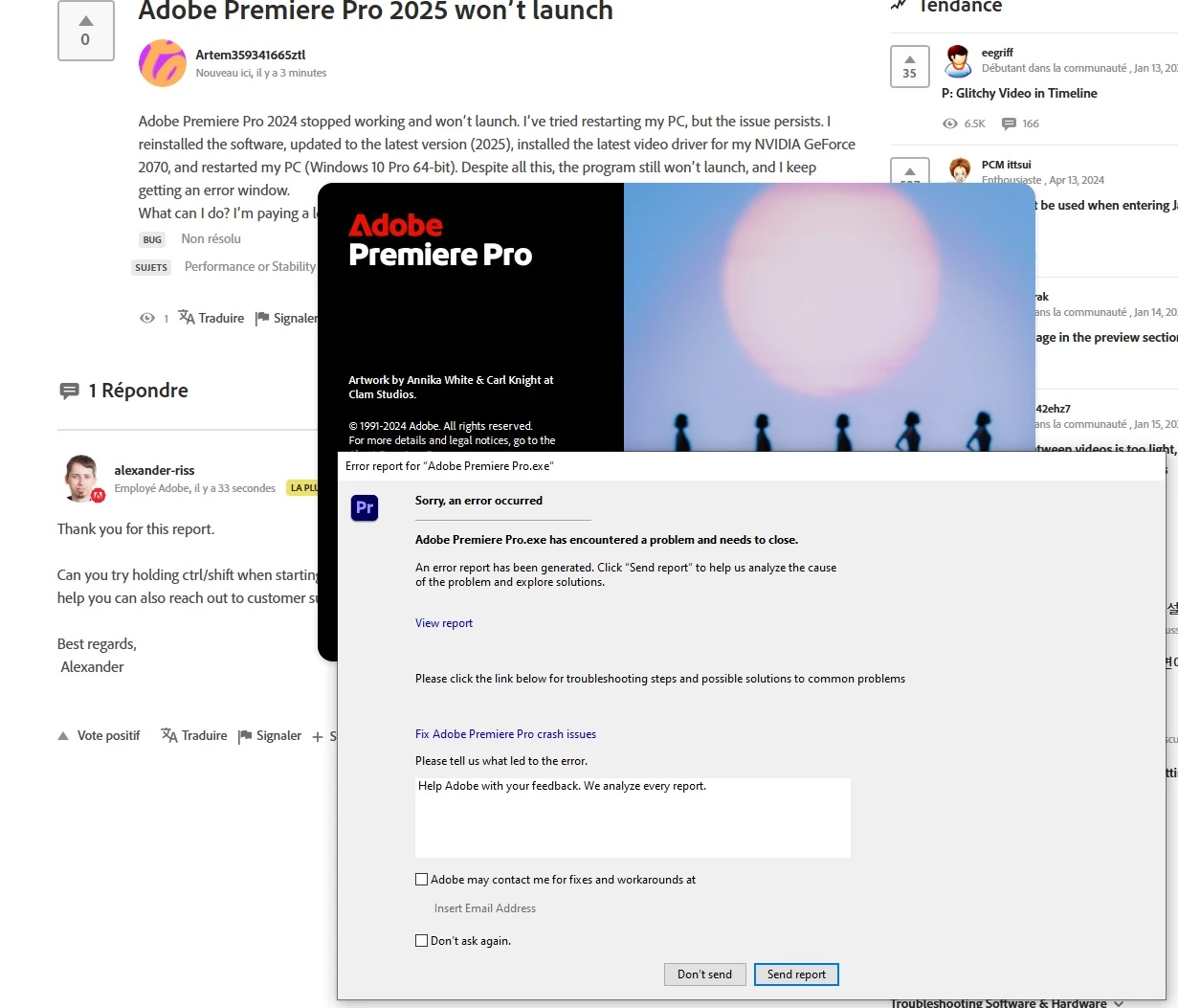 Adobe Premiere Pro 2024 stopped working and won’t launch. I’ve tried restarting my PC, but the issue persists. I reinstalled the software, updated to the latest version (2025), installed the latest video driver for my NVIDIA GeForce 2070, and restarted my PC (Windows 10 Pro 64-bit). Despite all this, the program still won’t launch, and I keep getting an error window.