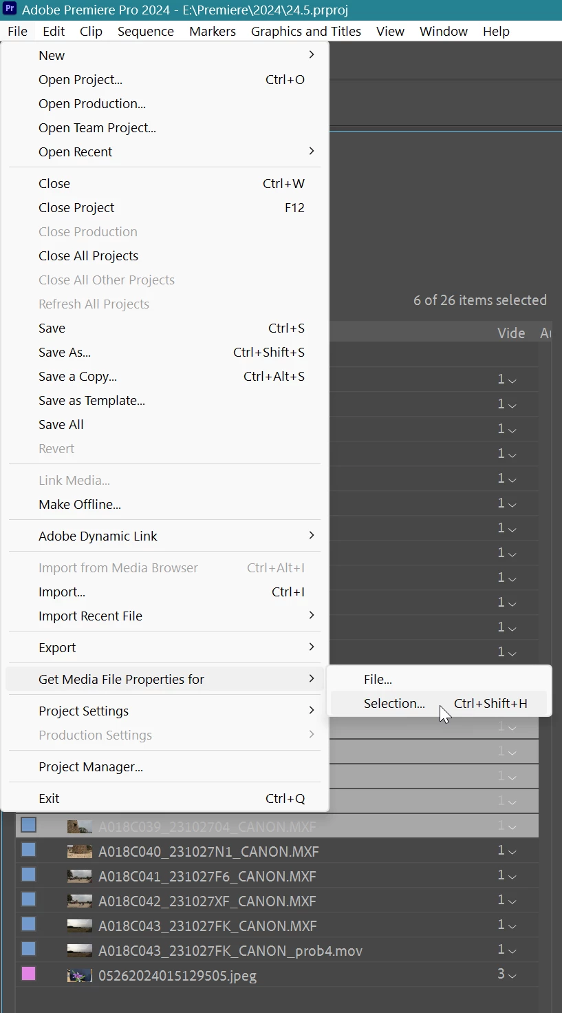 After 24.5 Premier Pro update "File>Get media file properties for selection" greyed out not working