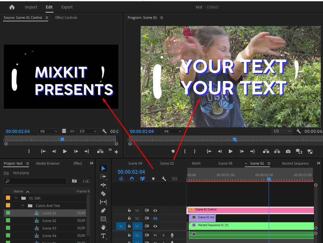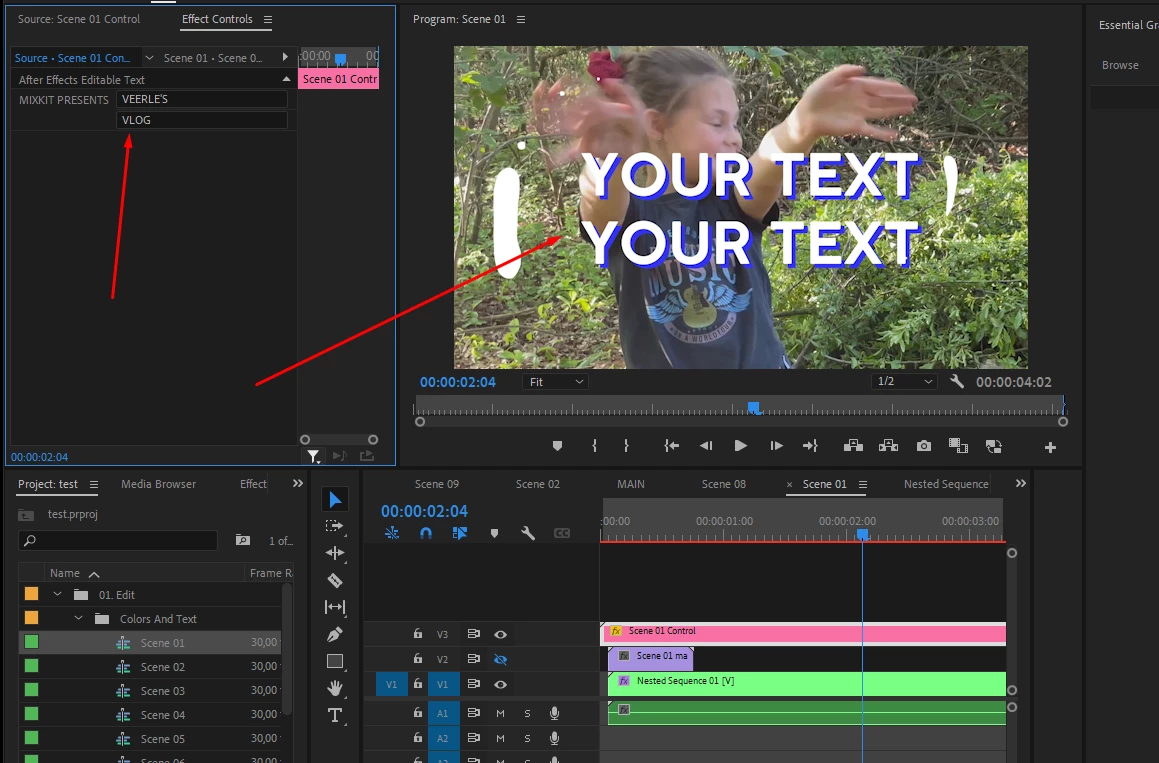 Now I want to change the text in Premier Pro. It already starts with a strange problem that in the actual video is the text "YOUR TEXT". The After Effect text says "MIXKIT PRESENTS" and I can't find where your text comes from.