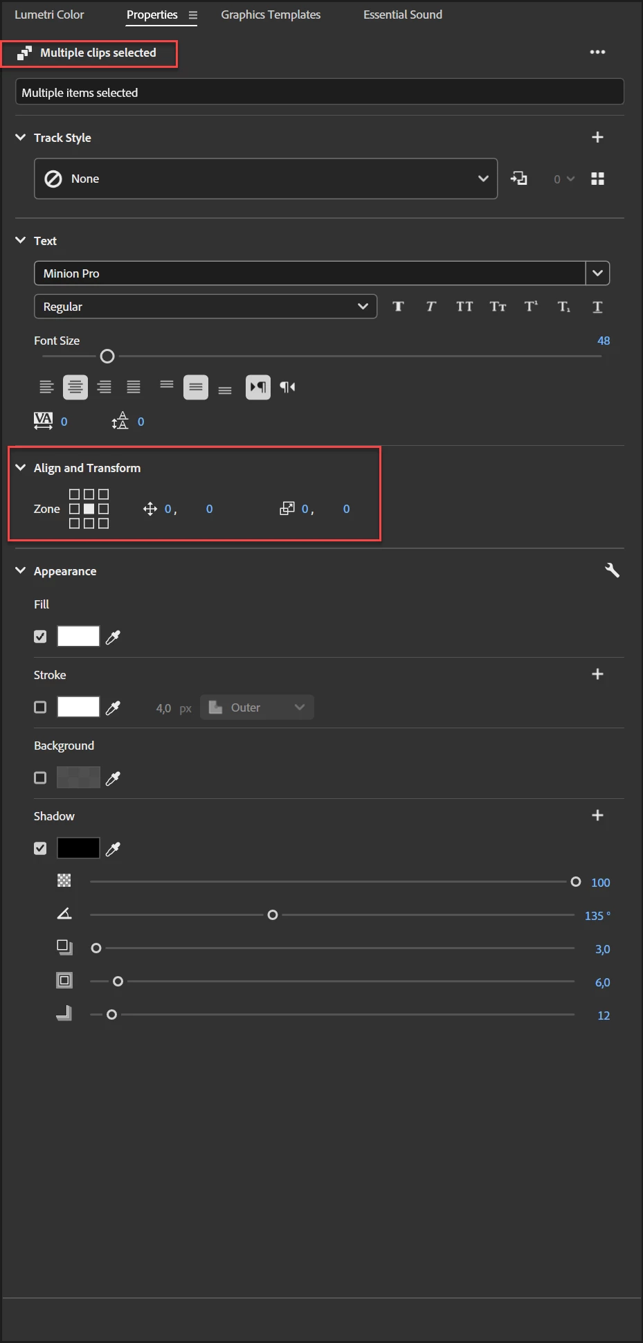 Hey, I have about thirty subtitles that I'd like to align at once to save time with the “Align and transform” tab, but when I select all the elements, there's no “Align and transform” menu. Don't tell me that in 2025 its not possible to do this on premiere pro, like I can modify the color, the scale of the text but i cant align ???