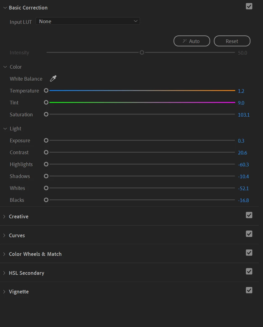 All Lumetri colour levels on left side
