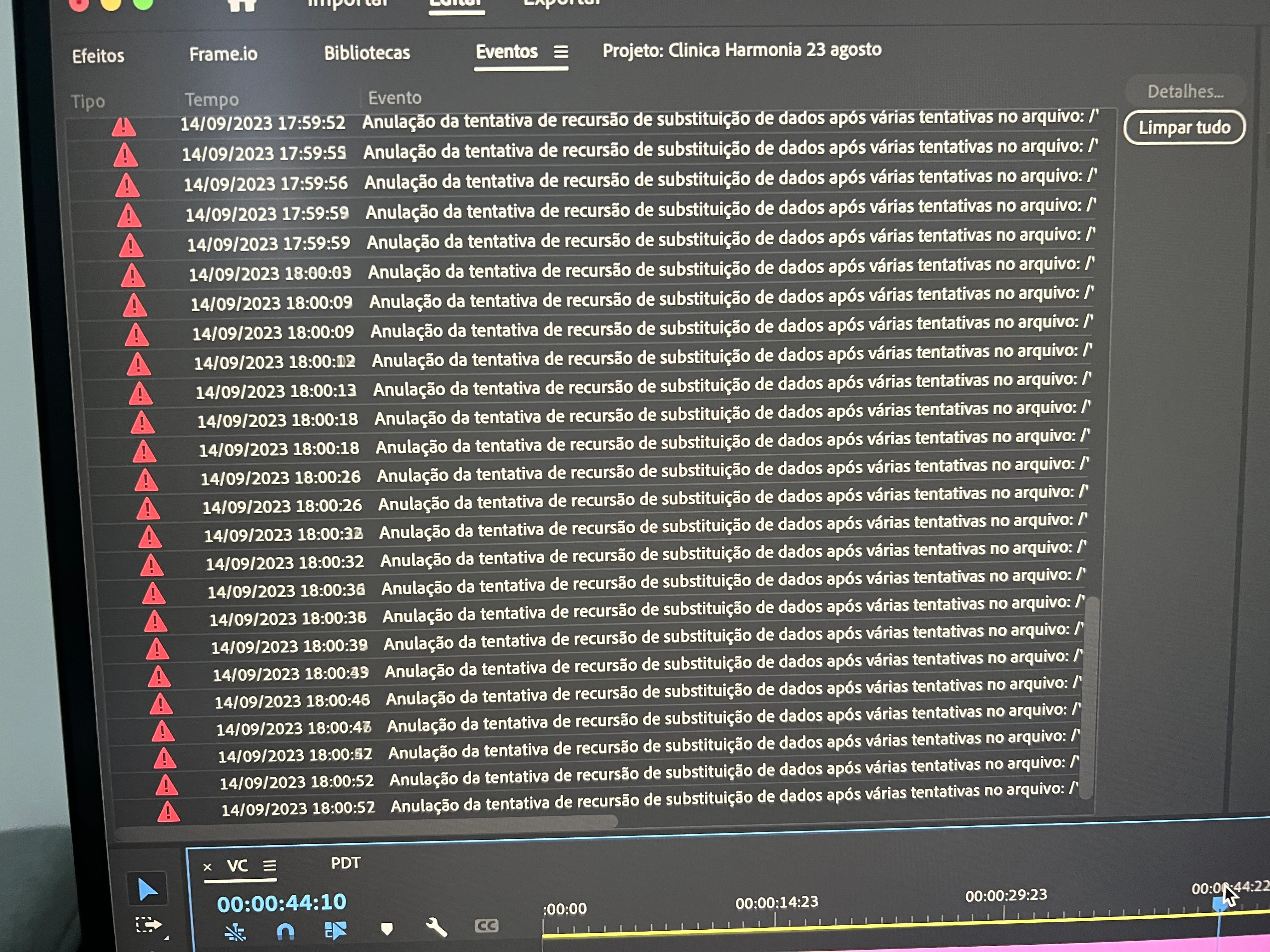 Estou recebendo tantas mensagens de "Anulação de tentativa de recurso de substituição de dados após várias tentativas no arquivo"que não consigo mais editar. Tenho vários projetos pra entregar e estou tendo q editar todos no Davince Resolve. Não acho solução pra esse problema na internet. Por favor, se alguém puder me ajudar ficaria muito grato
