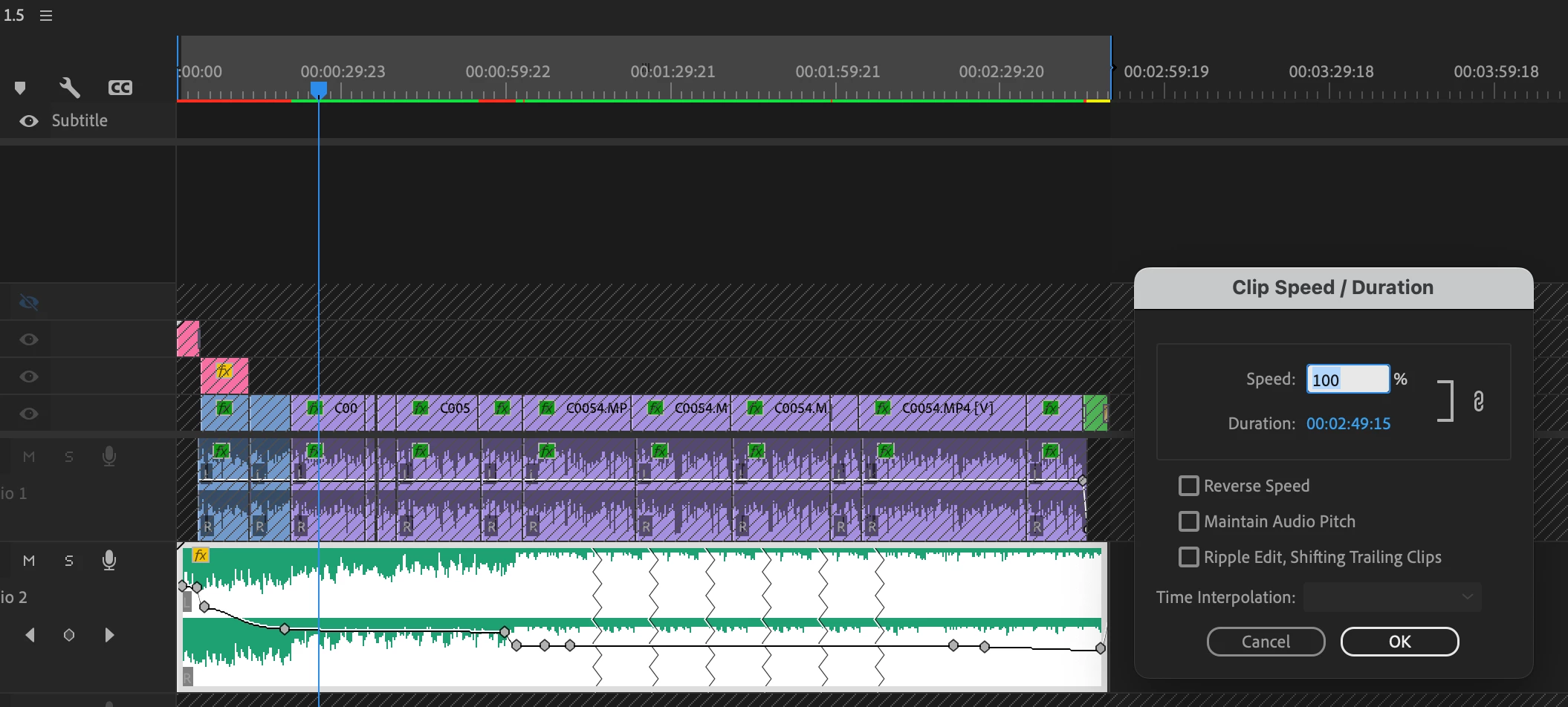 Sequence 1.5 Speed/Duration reverts to 100%, the audio track is now shorter and cuts off the end of the track.