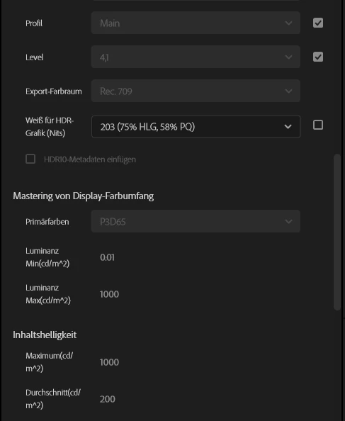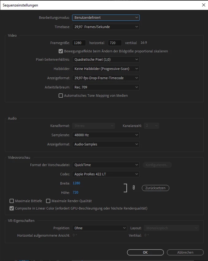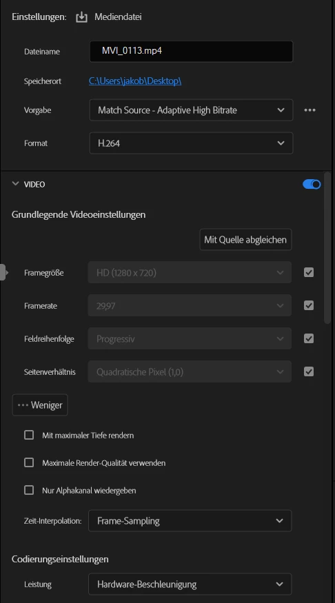 Anbei sind meine Sequenz- und Exporteinstellungen.
