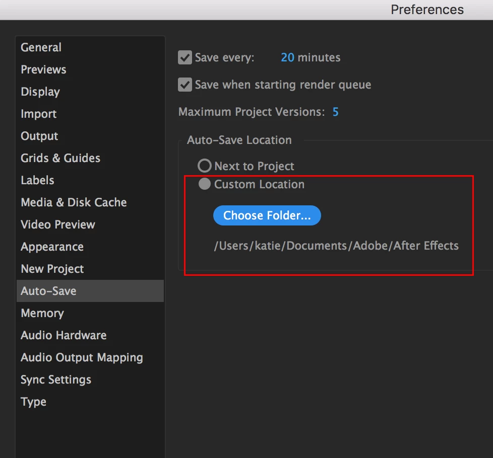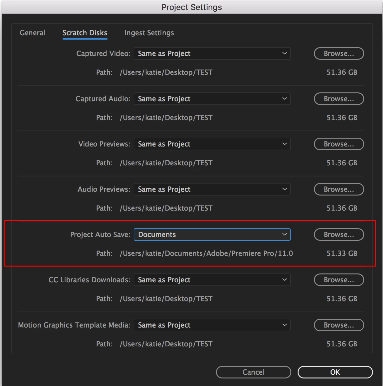 Starting a Project: When you start a file choose the Scratch Disks tab to change the Project Auto Save location.