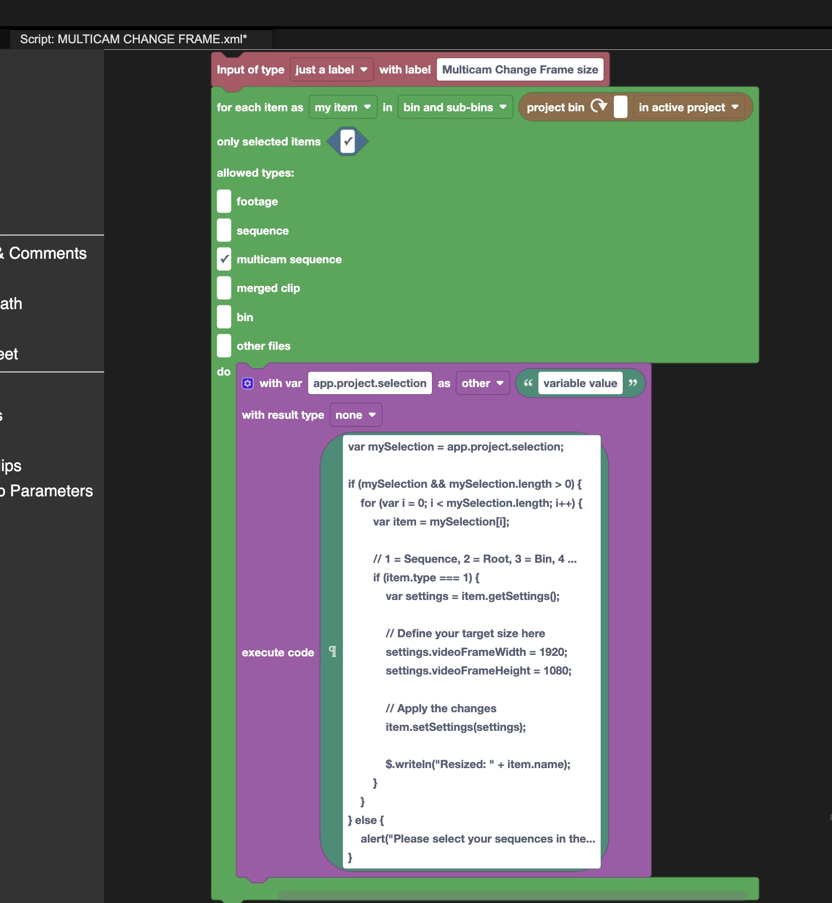 I am working on a script that can change selected multicam or sequence video frame size settings.