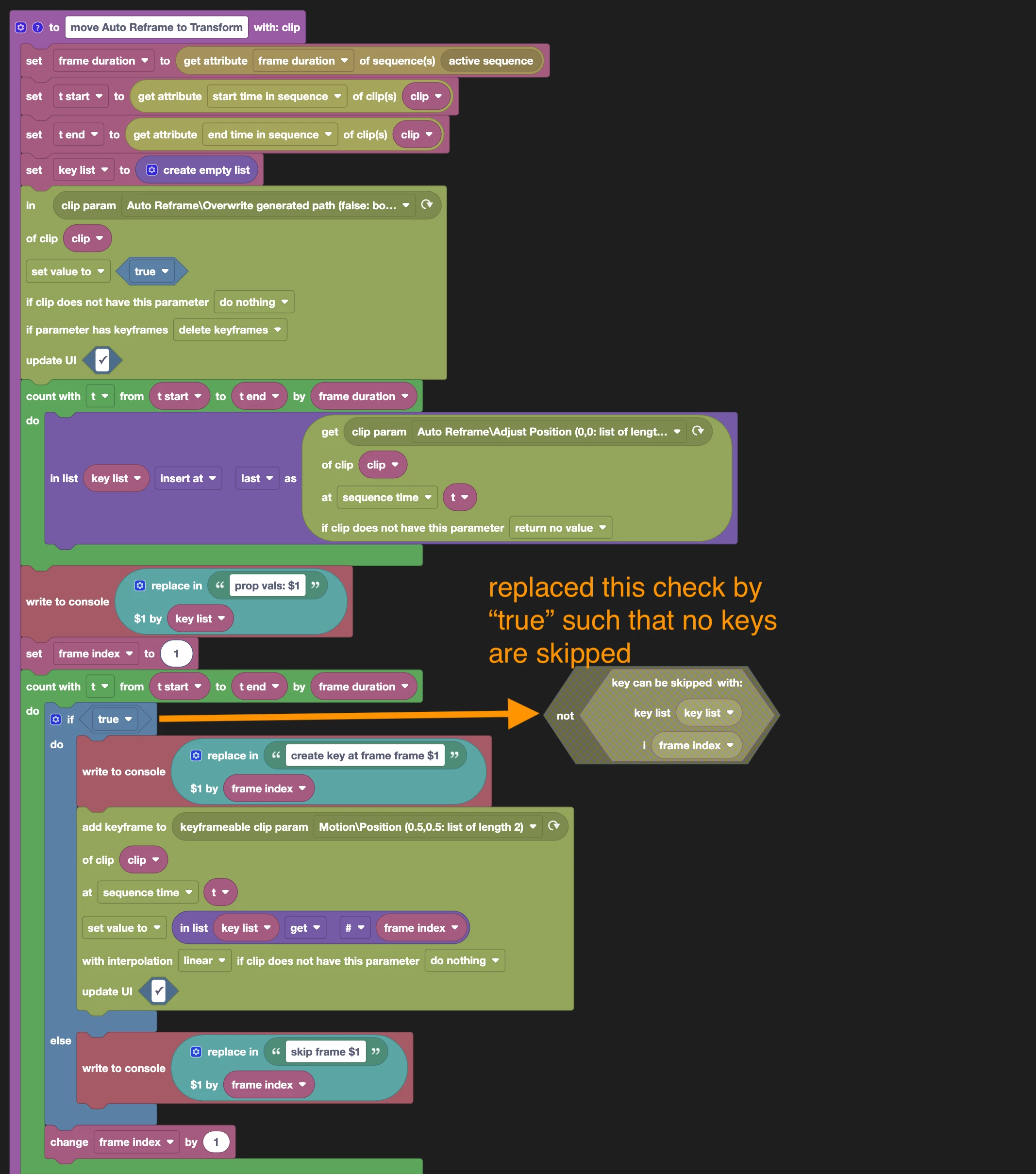 I just looked at the block code of "Copy Auto Reframe Track to Transform" and noticed that it contains some logic to minimize the number of keyframes. For every frame it looks at the frame before and the frame after and if the agerage of these two is almost identical to the value at the current frame, it does NOT introduce a keyframe at the current frame. Due to this "almost equal" and keyframe easing, this might not be 100% accurate.