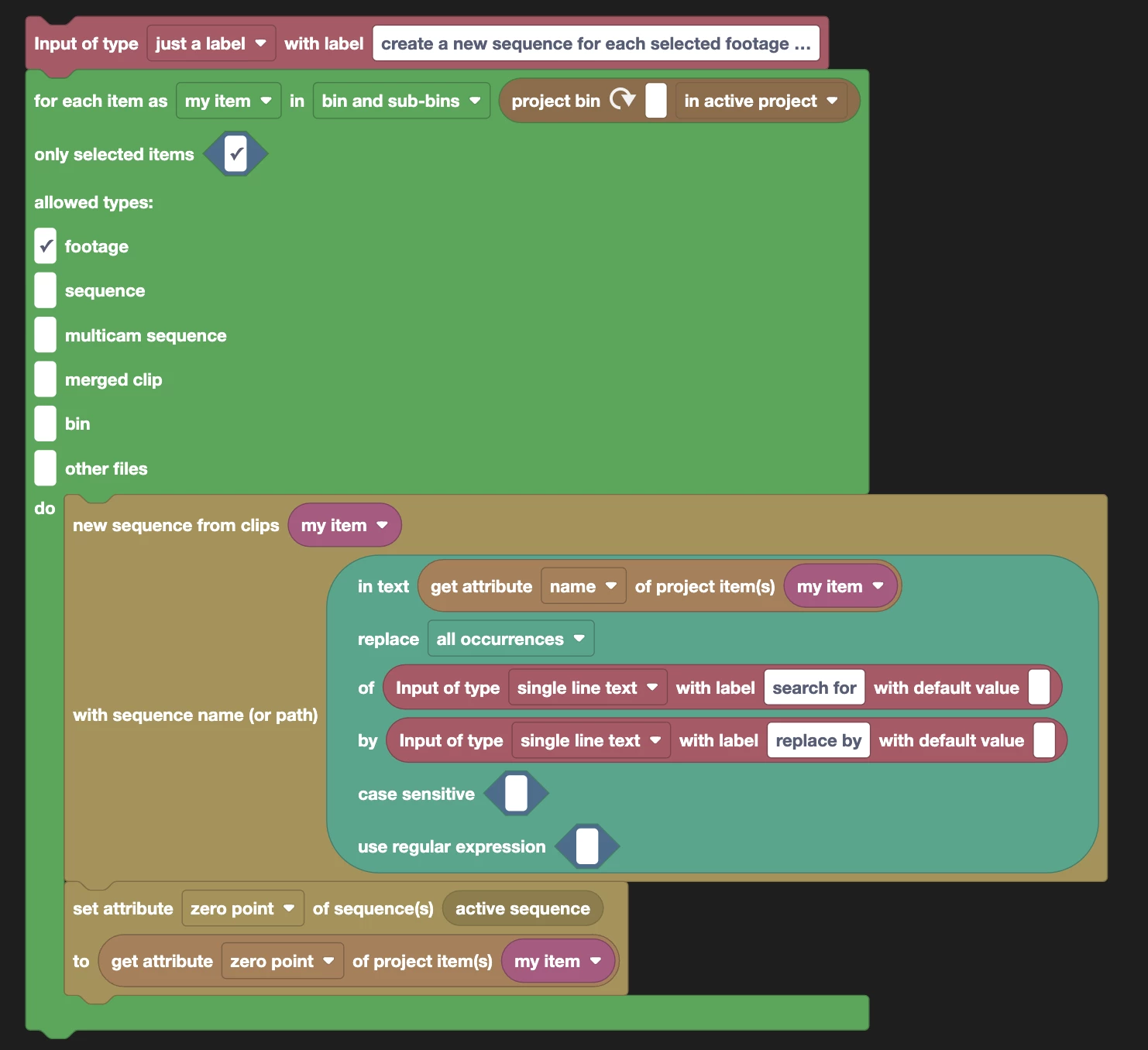 Using Automated Block, I am trying to create individual sequences to the spec of selected clips in the PP project panel. The created sequences’ timecode should be the same as the clip that it was created from.