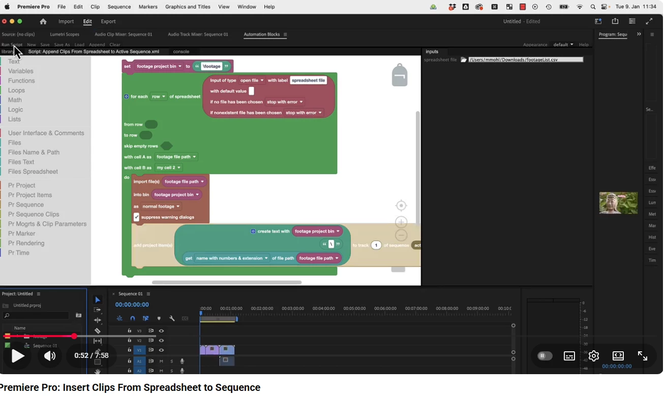Automation Blocks, How to Insert Clips From Spreadsheet to Sequence